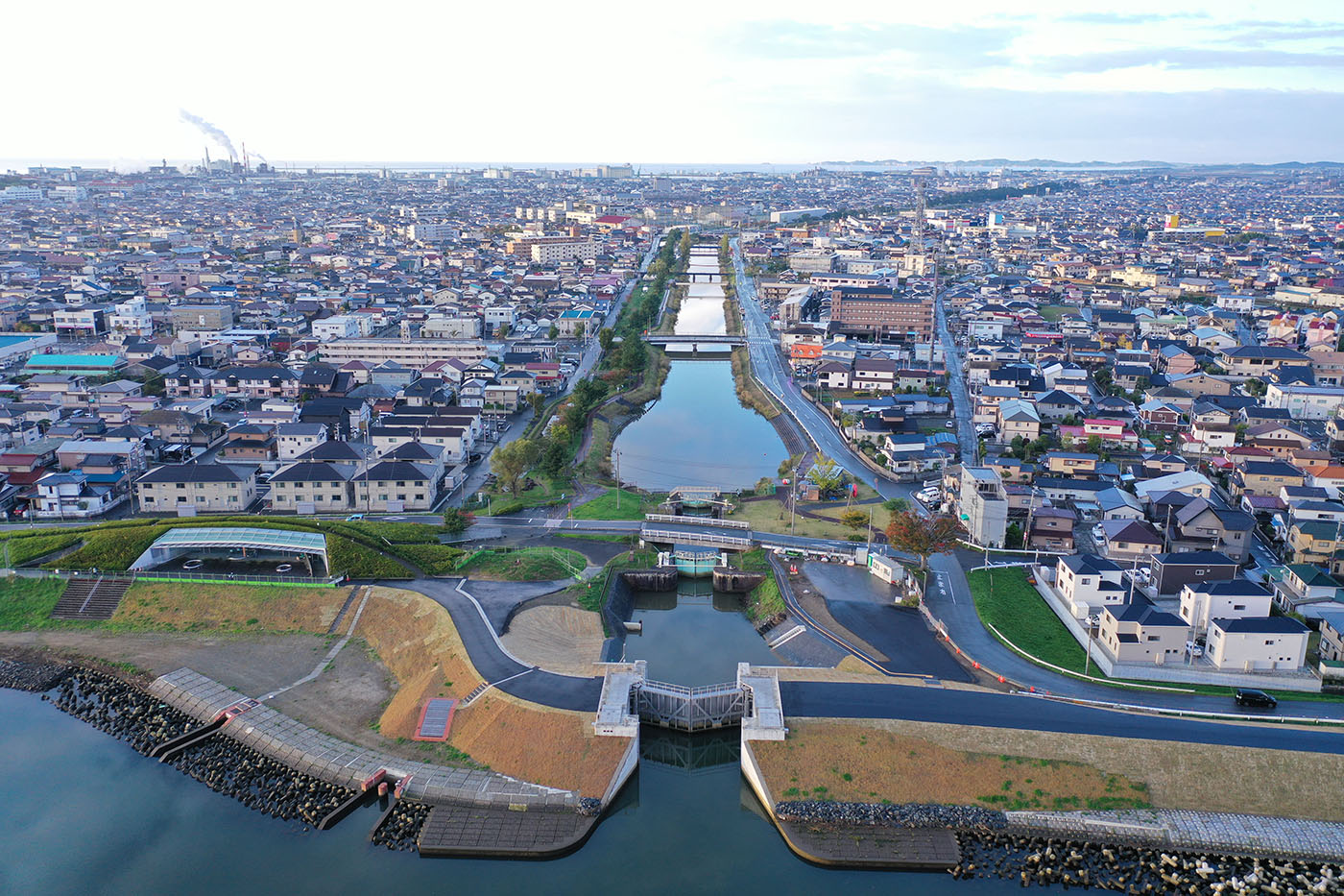 写真1.中央下が石井水門。後方に石井閘門とその奥に北上運河を中心に石巻市の市街地を臨む。