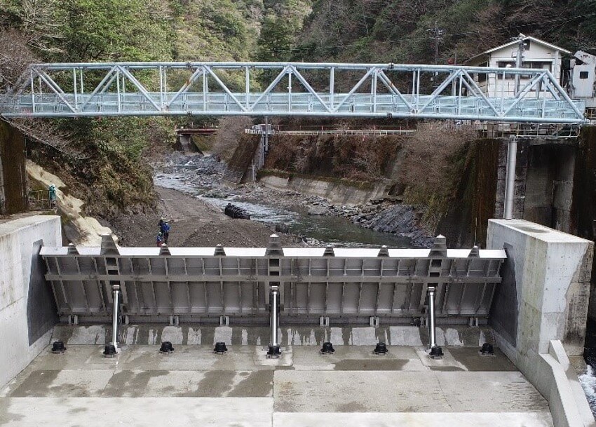 槇之口発電所取水堰は、宮崎県に設置されたステンレス鋼製起伏ゲートです。従来、槇之口発電所の取水堰にはゴム堰が適用されていましたが、度重なる洪水時の転石流下によりゴム袋体に多くの損傷が発生し、使用し続けるには困難な状況になっていました。そこで取水堰の更新に際して、衝撃・摩耗対策として、特に耐摩耗性に優れた当社の省合金ステンレス鋼SUS821L1(NSSC 2120®、21Cr-2Ni)がゲートの素材に採用され、取水堰の長寿命化に貢献しています。今回の受賞にあたっては、貴重な再生可能エネルギーである水力発電所の取水堰改造工事に、ステンレス鋼で貢献した先駆け的な事例であることが高く評価されています。